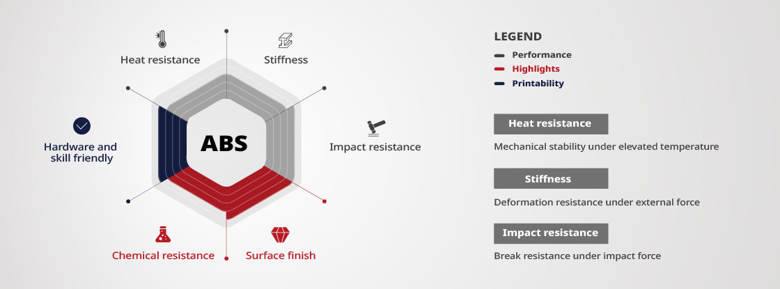 Seine professionelle Qualität macht es sehr vielseitig und widerstandsfähig für mechanische und technische Teile. ABS wird in der Industrie häufig eingesetzt und ist eines der am meisten verwendeten Materialien im 3D-Druck.