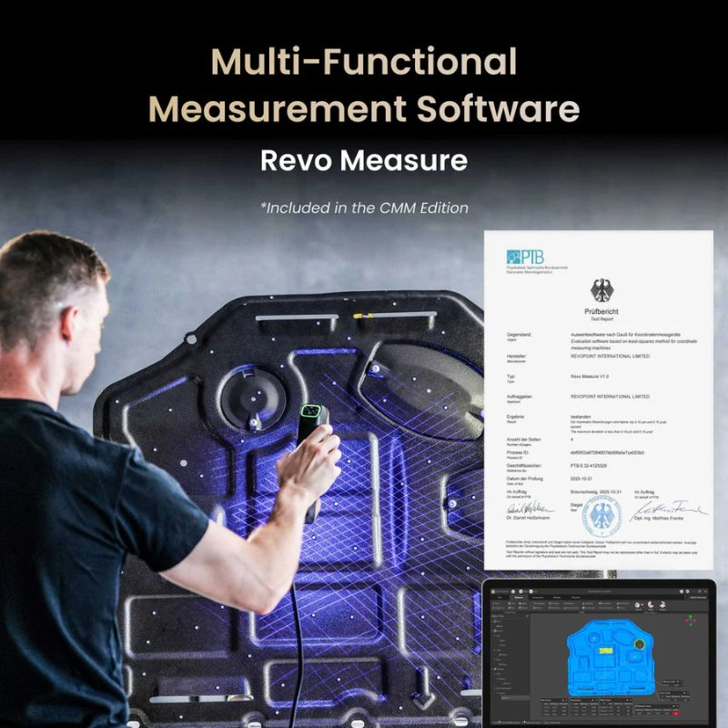 Die Revopoint MetroY Ultra CMM Edition ist eine hochpräzise 3D-Messtechniklösung für die Echtzeit-Maßprüfung vor Ort. Zusätzlich zu Mehrlinien-Laser- und strukturierter Licht-Technologie integriert diese Edition spezielle Metrologie-Tools mit der CMM-zertifizierten Ball Plate aus Kohlefaser und der Software Revo Measure.