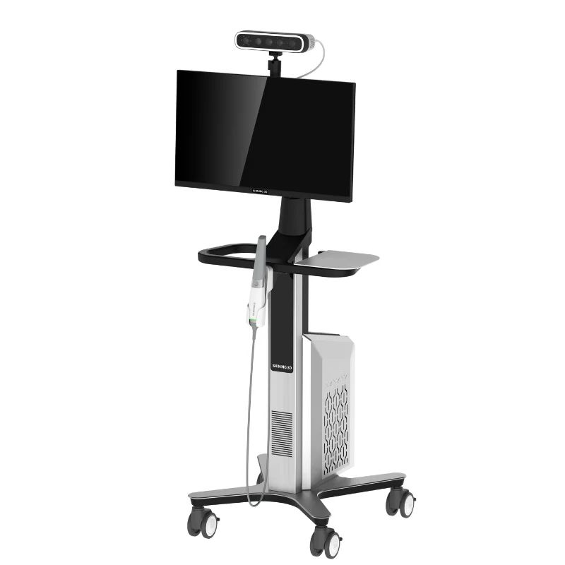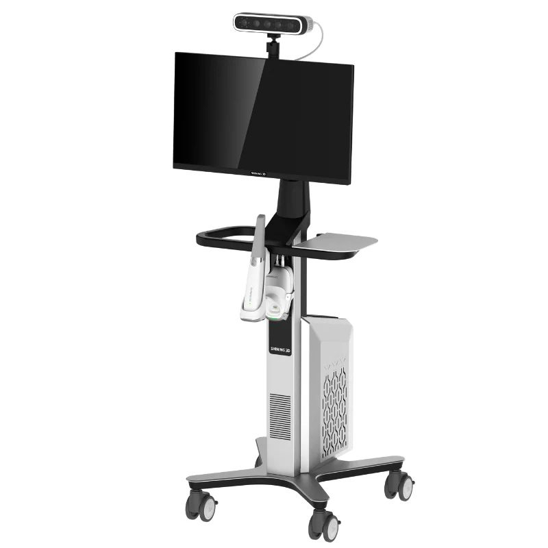 Die Shining 3D e-Motion Workstation ist eine spezielle Arbeitsstation für die digitale Abformung. Sie umfasst einen ergonomischen Wagen, eine Scannerhalterung, einen Bildschirm sowie einen für die Echtzeit-3D-Visualisierung optimierten Computer.