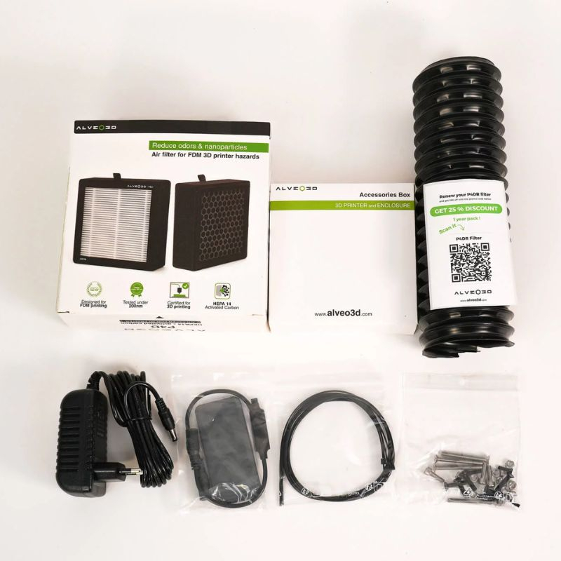 Dieses von Alveo3D entwickelte Filtersystem bietet eine effektive Lösung, indem es einen hochwirksamen HEPA14-Filter und einen Aktivkohlefilter kombiniert. Zusammen erfassen sie feine Partikel sowie einen großen Teil der chemischen Emissionen, die beim Drucken entstehen.