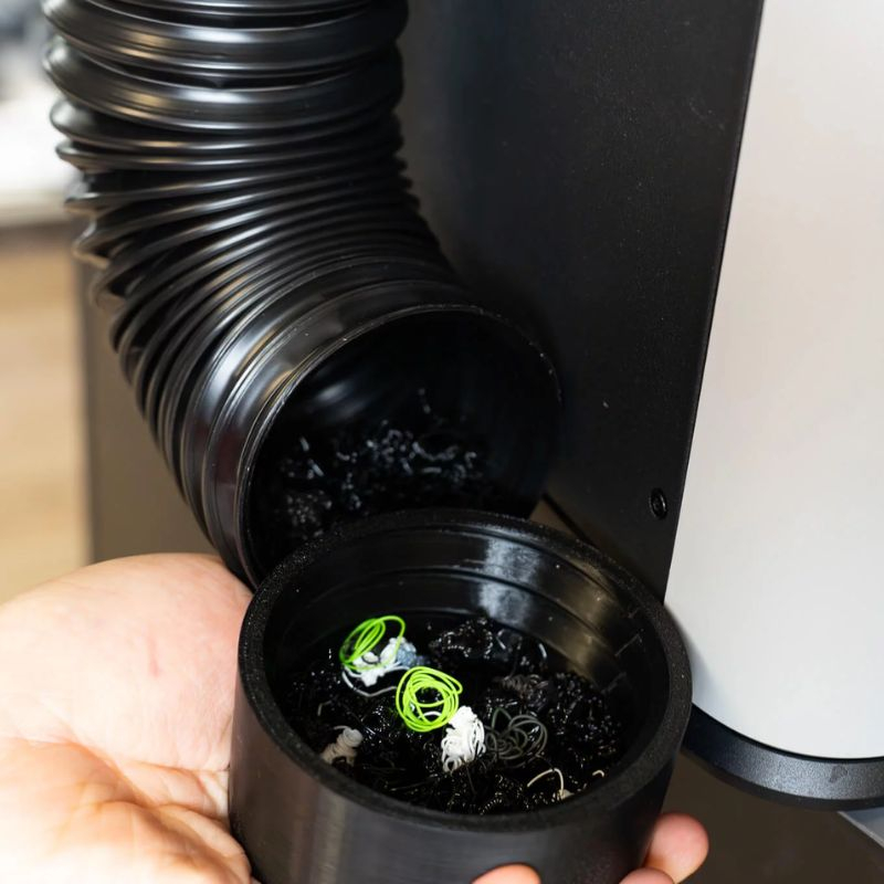 Filamentreste werden effizient im flexiblen Luftkanal des Kits gesammelt. Zum Reinigen und Entfernen der angesammelten Abfälle einfach das Rohr abschrauben. Dieses praktische Design erleichtert die Wartung und hält den Arbeitsplatz sauber und sicher beim 3D-Druck mit Bambu Lab H2 Druckern.