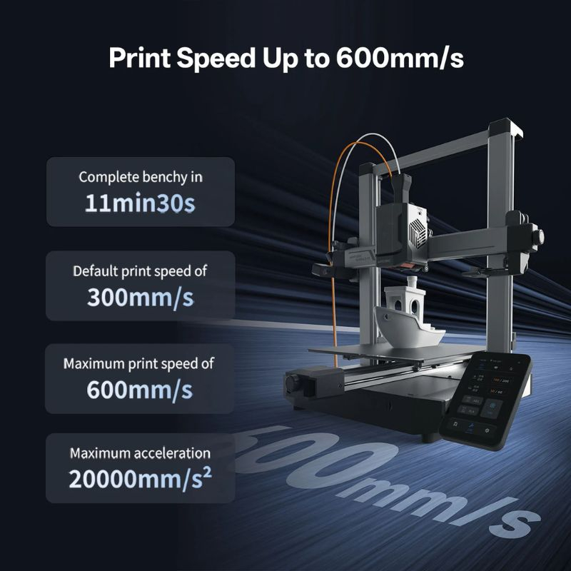 Der Kobra 3 V2 erreicht beeindruckende Geschwindigkeiten (bis zu 600 mm/s) und ist ideal für schnelles Prototyping und Kleinserienfertigung.