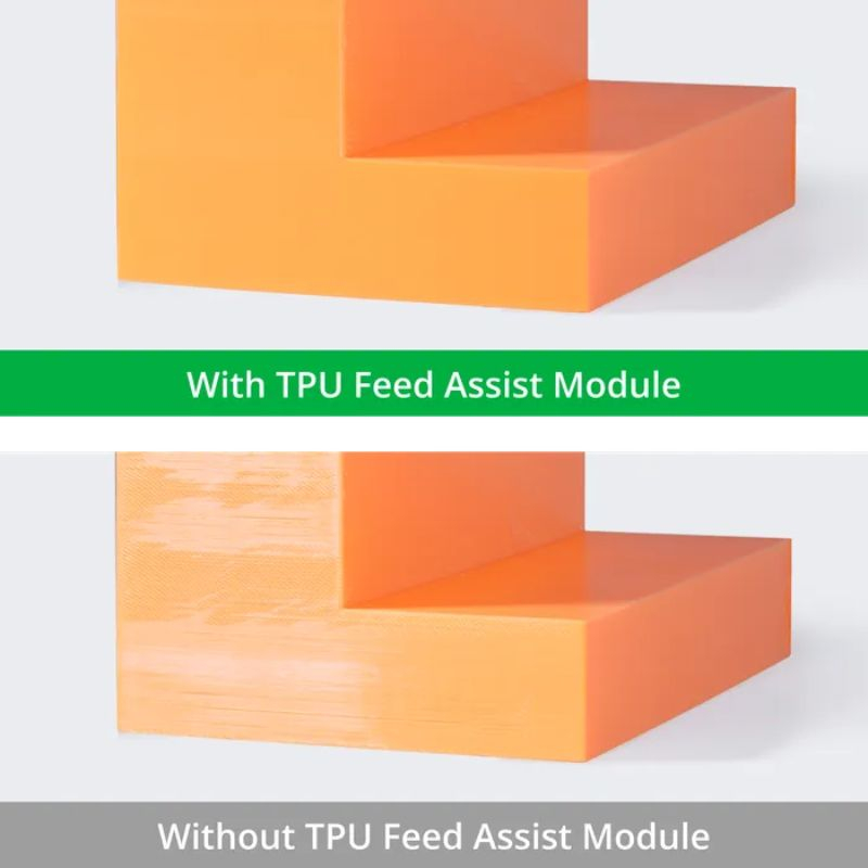 Dieses Modul bietet eine einfache, aber wirkungsvolle Lösung: ein aktives Filament-Zuführungssystem, das direkt in den Extrusionsprozess integriert ist. Es unterstützt den Vorschub des TPU-Filaments, reduziert mechanische Belastungen im Zuführweg und sorgt für eine deutlich gleichmäßigere Extrusion.