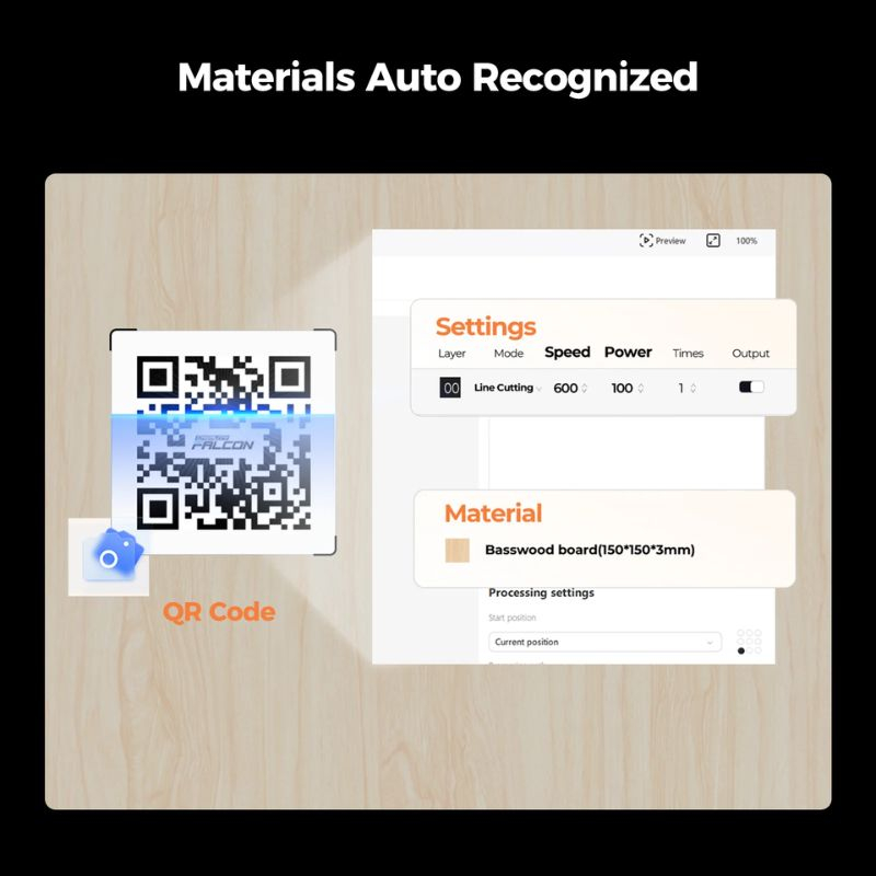 Der Falcon A1 erkennt Materialien über integrierte QR-Codes und passt die Parameter automatisch an – ganz ohne manuelle Einstellungen.