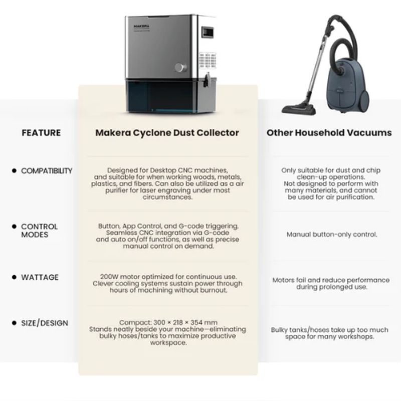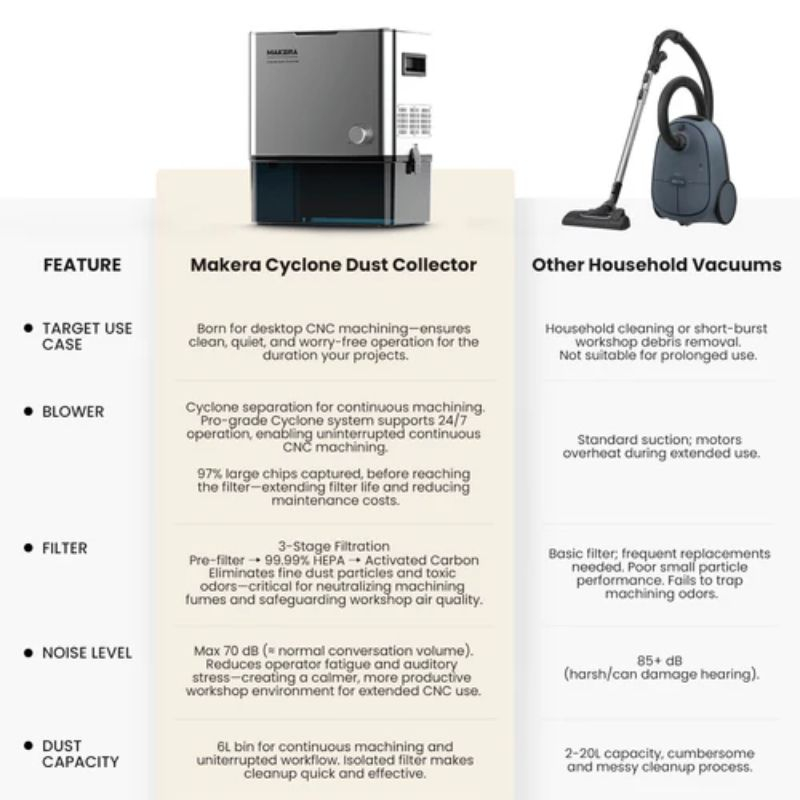 Die Aufrechterhaltung einer sauberen Bearbeitungsumgebung ist entscheidend für die Qualität der Teile, die Langlebigkeit der Maschine und die Sicherheit des Anwenders. Der Makera Cyclone Dust Collector erfüllt diese Anforderungen mit einem effizienten und leisen Design, das für kompakte Räume geeignet ist. Die Kombination aus Leistung, fortschrittlicher Filtration und Kompaktheit macht ihn zu einem unverzichtbaren Werkzeug für jede Desktop-CNC-Anlage, die Leistung und Sauberkeit vereinen möchte.