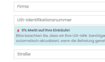 Sobald Sie Ihre USt-ID eingegeben und unser System (oder unser Team) diese validiert hat, können Sie automatisch mehrwertsteuerfrei einkaufen.