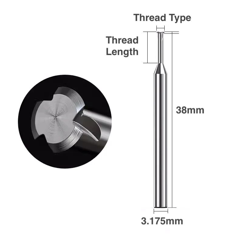 Der M3-Gewindebohrer (Ø 2.4 mm) x 9mm Makera Carvera ist ein CNC-Gewindewerkzeug für kleine Schrauben und Gewindeteile. Mit einer Geometrie, die für präzise Innengewinde auf Mikro-Metall- oder Kunststoffteilen optimiert ist, lässt er sich dank seines 3,175 mm (1/8") Schafts leicht in die Spindel einbauen.