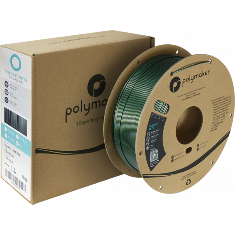 Polymaker PolyLite PETG Dunkelgrün ist ein hochwertiges PETG, das ein ausgezeichnetes Verhältnis von Druckfreundlichkeit und mechanischen Eigenschaften bietet und zwischen PLA und ABS liegt.