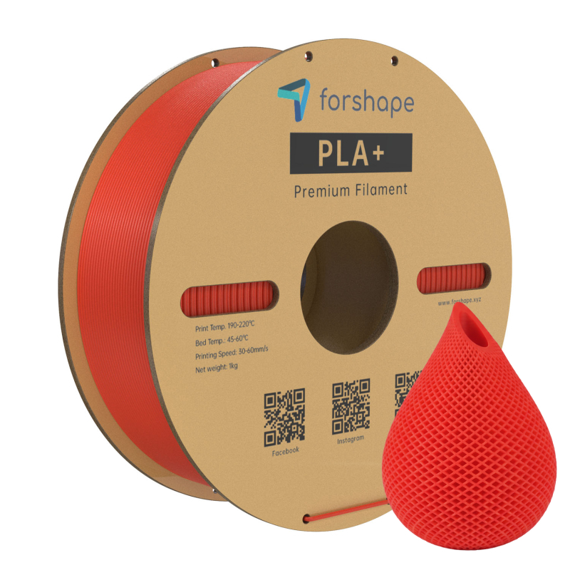 Es lässt sich sehr einfach drucken und haftet hervorragend auf der Druckplatte. Ideal für dekorative Teile, innovative Designs oder visuelle Prototypen. Die 1-kg-Spule PLA+ Rot Forshape wird im Durchmesser 1,75mm geliefert.