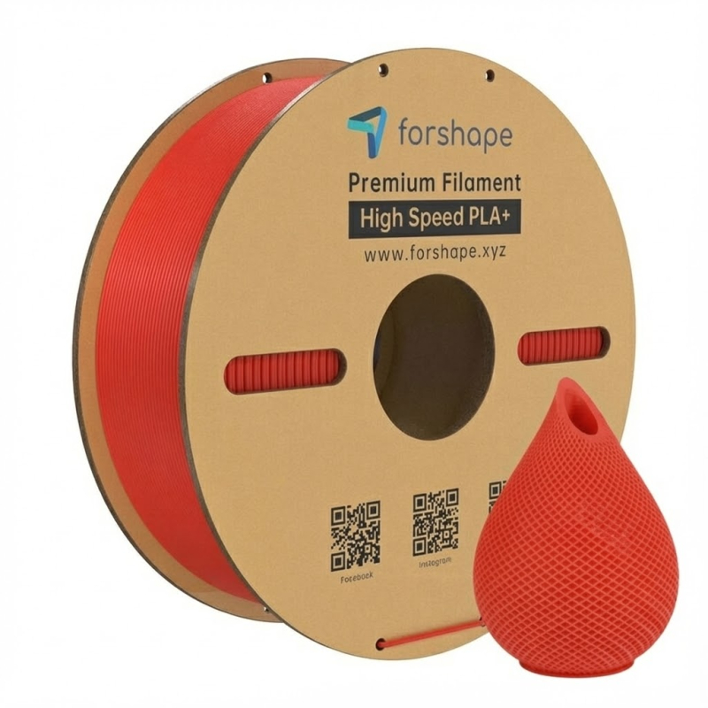 Das High-Speed-Filament PLA+ Forshape rot (PLA Hochgeschwindigkeitsfilament) ermöglicht Drucke mit einer Geschwindigkeit von bis zu 600 mm/s dank seiner einzigartigen Formulierung, die hohe Fließfähigkeit und schnelle Kühlung kombiniert.