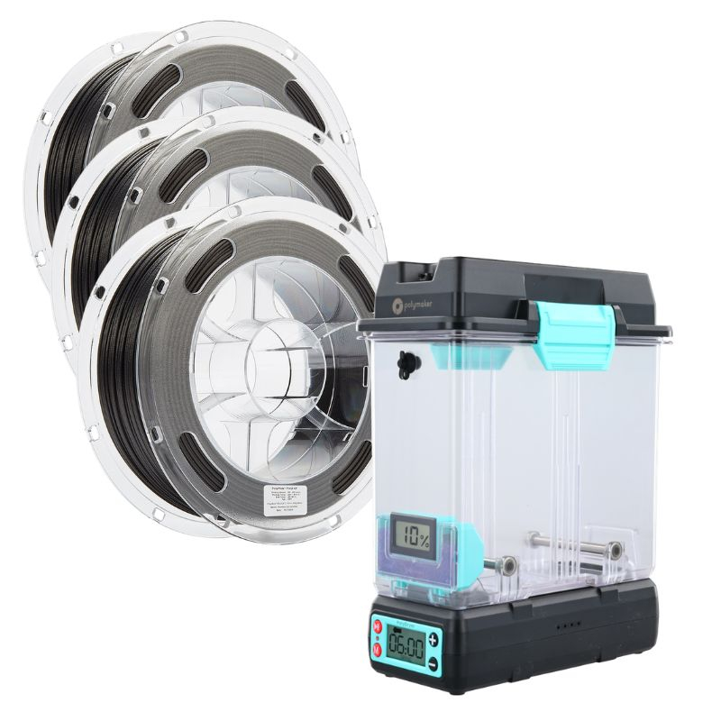 Dieses Polymaker-Bundle kombiniert PolyMide PA12-CF Schwarz und den PolyDryer Polymaker für anspruchsvollste technische 3D-Druckanwendungen. Entwickelt mit der “Warp Free”-Technologie bietet dieses mit Kohlefaser verstärkte Nylon-12-Filament hervorragende mechanische und thermische Eigenschaften bei gleichzeitig reduziertem Warping. In Kombination mit dem PolyDryer werden optimale Druckbedingungen durch reduzierte Feuchtigkeit gewährleistet, was gleichbleibende und zuverlässige Ergebnisse sicherstellt.