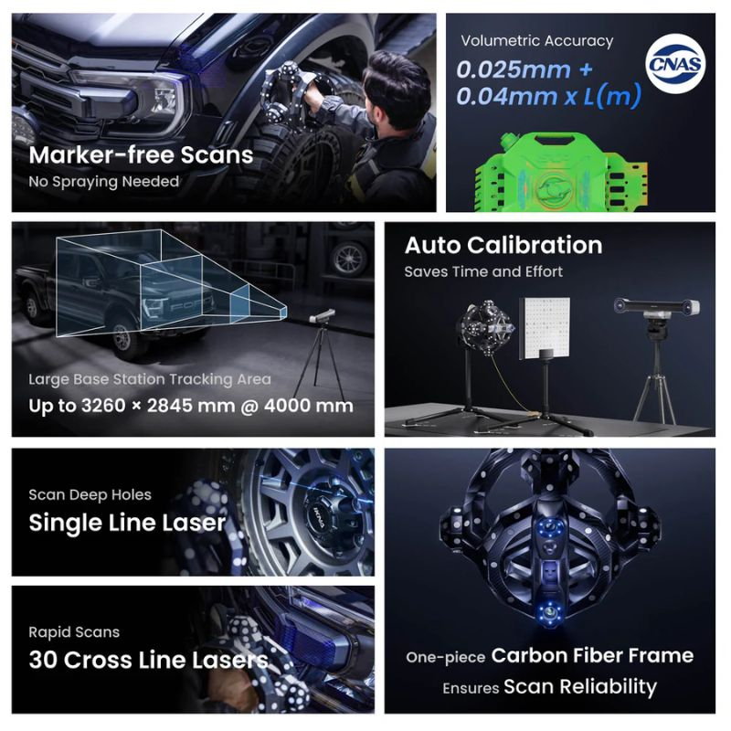 Der Revopoint Trackit ist ein professioneller 3D-Scanner mit markerlosem optischem Tracking, der sowohl Handheld- als auch Großformat-Modi, 0,02 mm Präzision und einen Carbonrahmen bietet.
