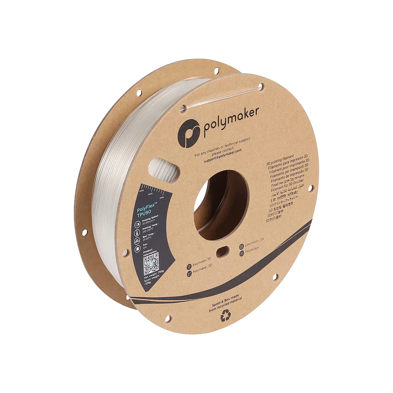 PolyFlex TPU90 Clear von Polymaker ist ein transluzentes, flexibles Filament für UV- und reißfeste Bauteile mit hoher Elastizität.