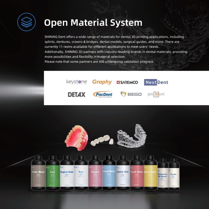 Der Shining 3D AccuFab-CEL unterstützt über zehn spezialisierte Resins (Schienen, Modelle, Prothesen) und ist mit Drittanbietern kompatibel. Dies bietet Materialfreiheit bei gleichzeitiger nahtloser Integration in den Produktionsworkflow.