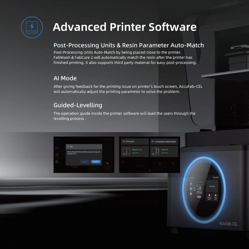 Die integrierte Software (AccuWare) enthält Designmodule (CreSplint, CreTemp, AccuDesign) und einen intelligenten Slicer, der Oberflächen automatisch erkennt, Stützstrukturen generiert und den Druck mit nur einem Klick vorbereitet.