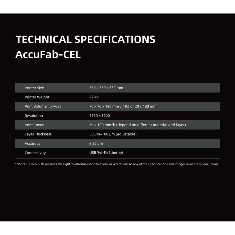 Der Shining 3D AccuFab-CEL wurde für Zahnärzte und Labore entwickelt. Er kombiniert hohe Präzision, schnelle Produktion und eine offene Materialplattform, um den Anforderungen an kieferorthopädische Modelle, chirurgische Schablonen und Prothesen gerecht zu werden. Die strikten Prozesse und die Automatisierung der Arbeitsschritte erleichtern den täglichen Einsatz und gewährleisten konstante Qualität.
